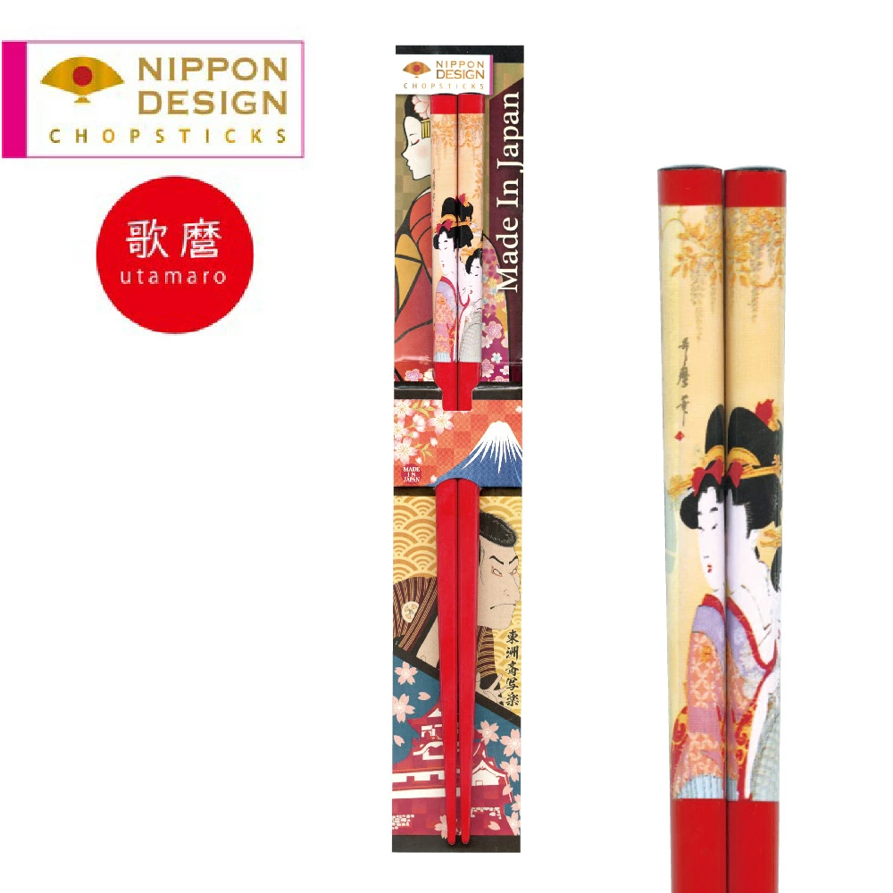 Eleganti bacchette in legno naturale decorate con una raffinata illustrazione in stile Ukiyo-e, ispirata al maestro Kitagawa Utamaro.