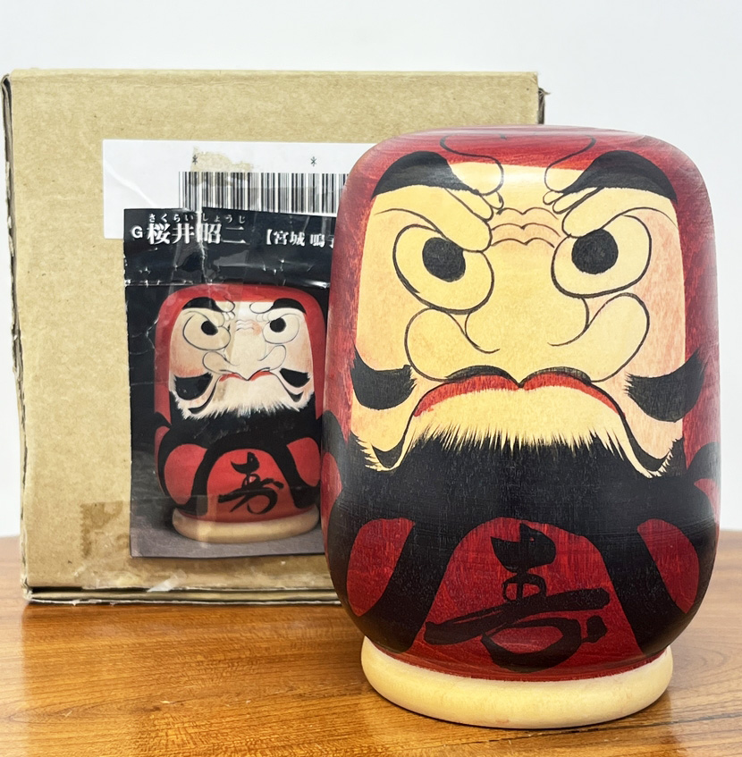 Questo raro Daruma è stato realizzato dal Maestro Sakurai Shoji (1927–2011) secondo il tradizionale stile Naruko, una delle scuole più celebri e riconoscibili nel mondo delle kokeshi tradizionali. Proprio nell’ambito di questo stile, Sakurai è considerato uno degli artisti più importanti e apprezzati. Le kokeshi Naruko, originarie dell’omonima località nella prefettura di Miyagi, si distinguono per le loro forme eleganti e armoniose, per i motivi floreali dipinti a mano e, spesso, per la tipica testa mobile che produce un leggero suono quando viene ruotata.