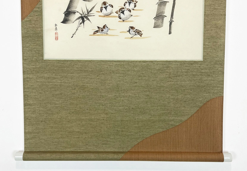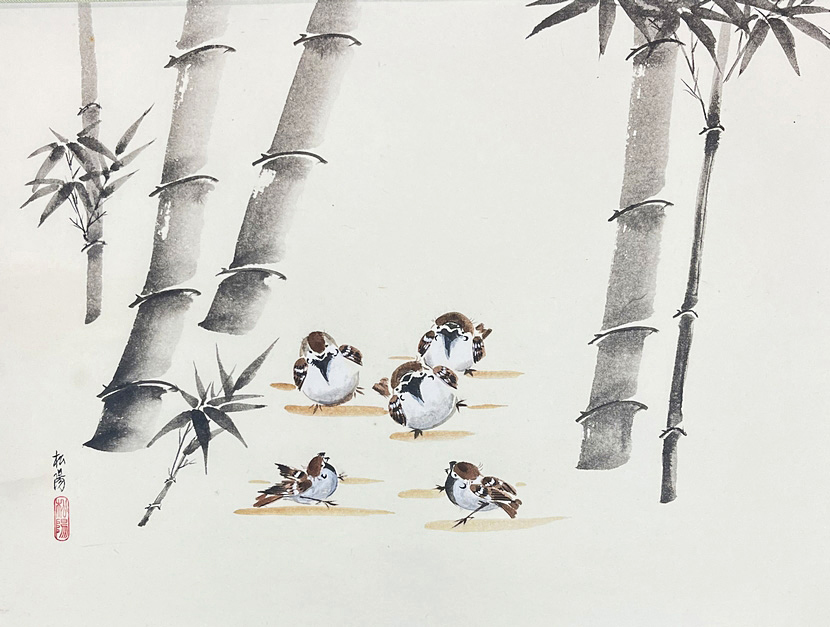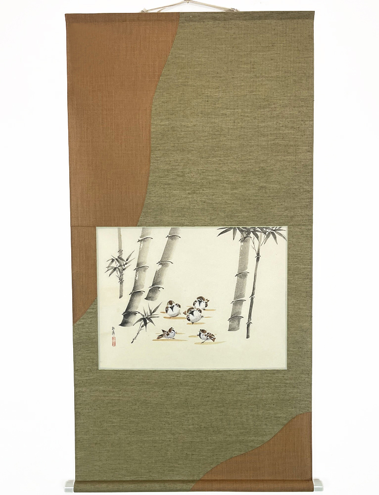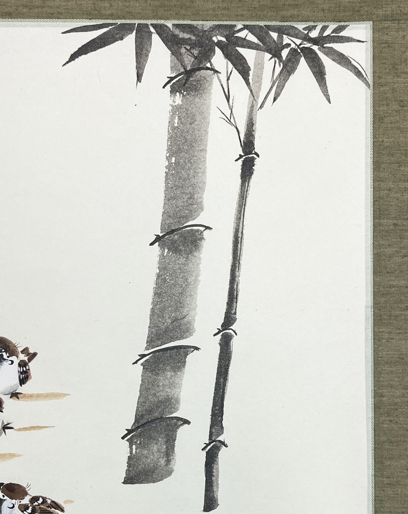 I passerotti sono circondati da steli di bambù, pianta che nella tradizione giapponese simboleggia forza, flessibilità e resistenza: pur piegandosi al vento e alle intemperie, infatti, non si spezza mai. Inoltre, il bambù è noto per la sua straordinaria rapidità di crescita — può crescere anche più di un metro al giorno — e per questo rappresenta anche la buona fortuna, lo sviluppo rapido e una crescita vigorosa e prospera.