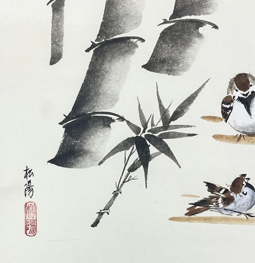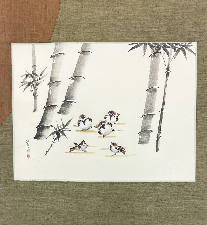 Il titolo dell’opera è “Take ni Suzume“, che in giapponese significa “Passeri tra i bambù“. La scena raffigura un gruppo di passeri tra gli steli di bambù, due elementi carichi di significato nella cultura giapponese e spesso accostati per il loro valore simbolico.