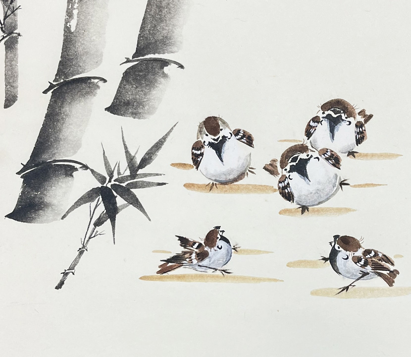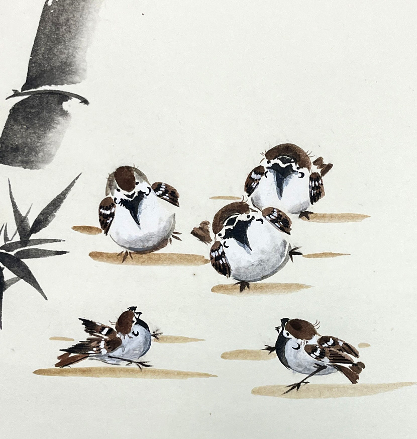 Il passero (suzume) è un uccello molto diffuso in Giappone, spesso presente nei campi, nei giardini e intorno alle case di campagna. Per questo è diventato emblema della vita semplice e spensierata, dell’esistenza umile ma serena, ricca di piccole gioie quotidiane.