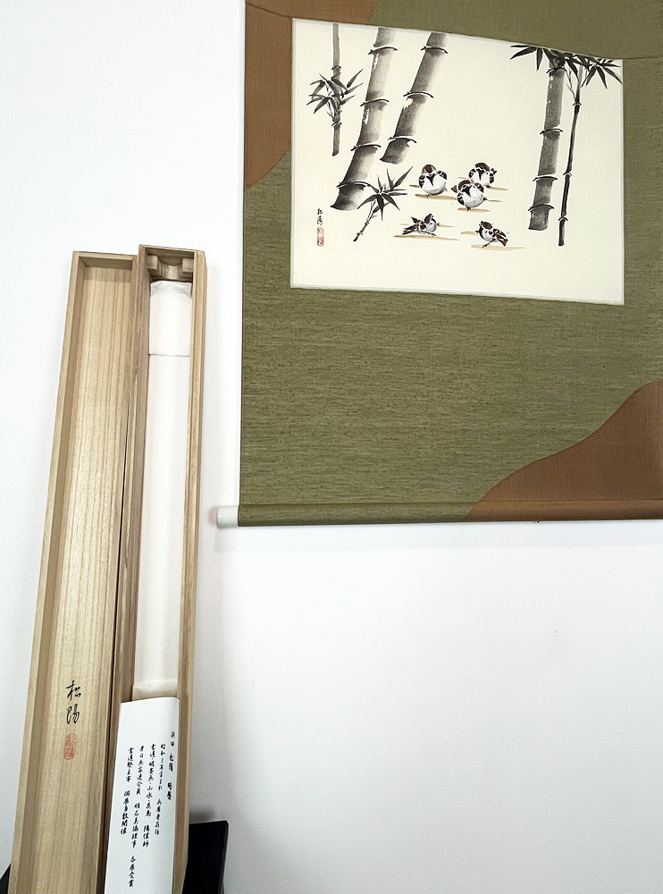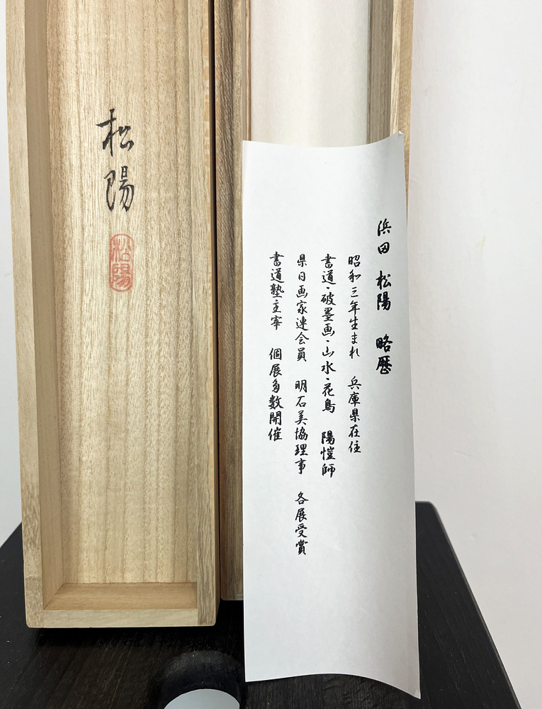 Il kakemono è firmato e timbrato in basso a sinistra dall’artista Hamada Shōyō ed è custodito nella sua scatola originale in legno di paulownia, timbrata e firmata all’interno.