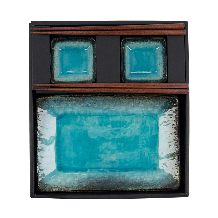 Raffinato set sushi firmato Tokyo Design Studio, pensato per due persone e caratterizzato dalla serie Yamasaku Sky Blue, ispirata ai colori dell’acqua e del cielo.